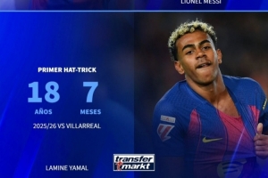 24直播网03月03日讯 德国转会市场盘点球星首次戴帽年龄。姆巴佩最年轻,仅17岁11个月;亚马尔18岁7个月,梅西19岁8岁。内马尔和C罗则分别为18岁2个月和22岁11个月。数据显示,当今足坛新星正以更年轻年龄上演帽子戏法。