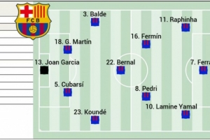 24直播网03月03日讯 《阿斯报》预测巴萨将在国王杯半决赛次回合主场对阵马竞的首发阵容。在首回合0-4惨败后,巴萨预计将由门将霍安·加西亚领衔,后防由巴尔德、马丁、库巴西和孔德组成。中场由费尔明、贝尔纳尔和佩德里担纲,锋线则由拉菲尼亚、费兰和亚马尔组成。