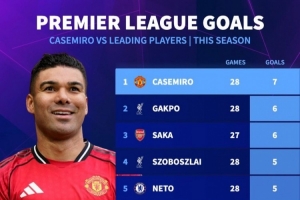 24直播网03月16日讯 英超第30轮,卡塞米罗建功助曼联3-1胜维拉。据统计,他本赛季28场已打入7球,这一进球数在并列的榜单上领先于包括萨拉赫、萨卡在内的多名顶级攻击手,展现了出色的进攻能力。