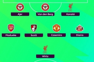24直播网02月04日讯 英超第24轮后,传奇前锋希勒评选出本轮最佳阵。利物浦的埃基蒂克、维尔茨和科纳特,阿森纳的马杜埃凯,以及曼联的卡塞米罗等球员悉数入选。门将为布伦特福德的凯莱赫。