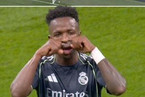 24直播网03月18日讯 欧冠次回合,皇马客场1-1曼城。维尼修斯制造点球并主罚破门,随后做出“让你哭”的庆祝动作,疑似回应上赛季曼城球迷嘲讽他的TIFO行为。