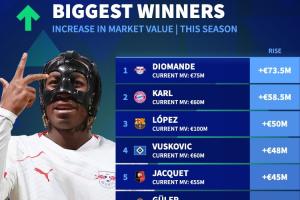 本赛季身价上涨TOP10:迪奥曼德、卡尔前2,费尔明翻倍到1亿