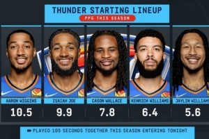本场比赛雷霆的首发是阿隆·维金斯、以赛亚·乔、卡森·华莱斯、肯里奇·威廉姆斯、杰林·威廉姆斯,其中仅有维金斯场均得分上双,本赛季此前,这套首发仅合同打了105秒。