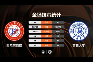 吉林大学:方伯杨20分、罗轶16分、朱凯乐10分、陈前程8分、宋梓滔8分、王嘉威7分6板、刘滨畅5分9板5助