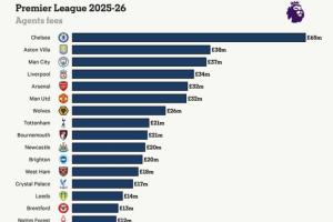 英超球队经纪人费用:切尔西6500万镑领跑,维拉、利物浦前三