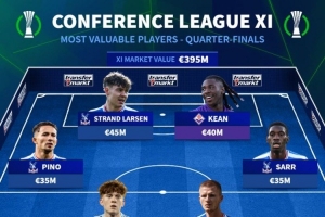 德转发布欧协联1/4决赛身价最高阵容:水晶宫球员包揽九席