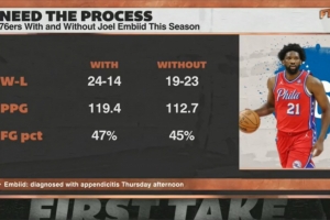 恩比德出战时,76人24胜14负,场均119.3分,全队投篮命中率47%;