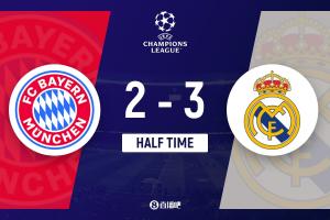 姆巴佩破门,维尼修斯助攻!第42分钟,维尼修斯左路单兵推进后横传,姆巴佩插上冷静推射破门,拜仁2-3皇马!总比分拜仁4-4皇马!↓