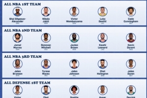 24直播网04月17日讯 美记Jake Weinbach预测本赛季奖项:MVP亚历山大,最佳防守球员文班亚马。一阵阵容包括重获资格的东契奇与坎宁安。该预测涵盖了MVP、最佳新秀、最佳进步球员、最佳第六人及一二三阵、一二防的完整人选。
