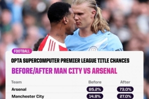 但OPTA超算仍然看好枪手最终夺冠,在本场比赛之前,阿森纳夺冠概率高达85.2、曼城仅14.8%。而在客场失利之后,枪手的夺冠概率依然高达73%、曼城仅上升至27%。